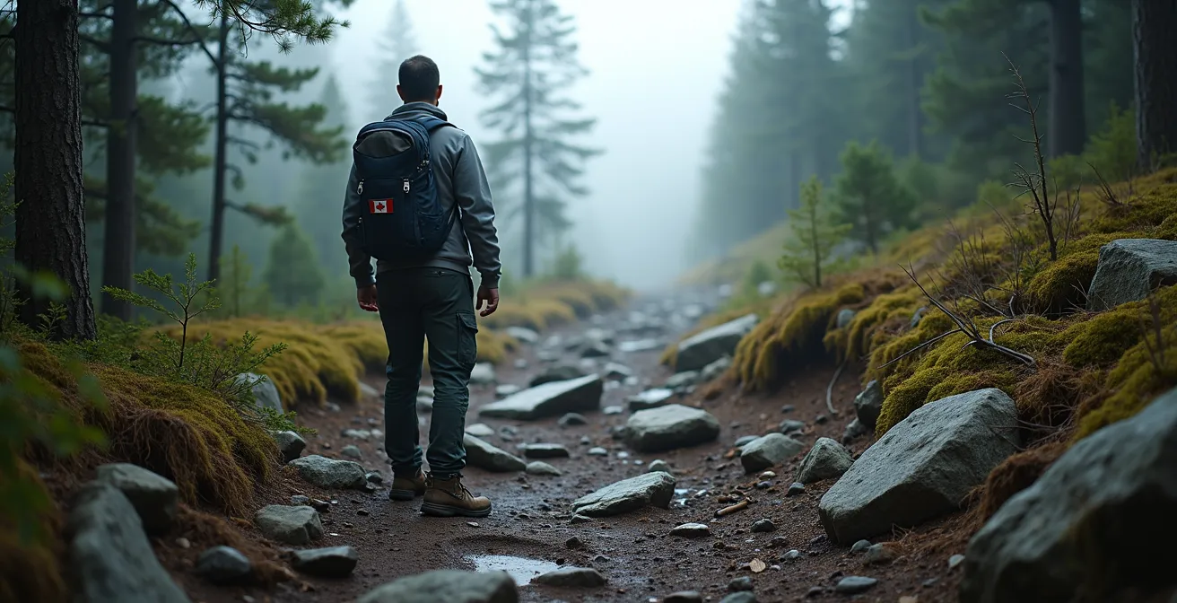 La principale source d’erreur pour un randonneur européen est la sous-estimation du terrain. Un sentier canadien qualifié de « facile » ou « intermédiaire » n’a rien à voir avec son équivalent alpin. Là où l’Europe propose des lacets réguliers et un sol souvent travaillé, le Canada offre un terrain brut. Le concept de fatigue neuromusculaire est ici central. Sur les sentiers du Bouclier Canadien, par exemple, même un parcours avec peu de dénivelé vous confronte à un enchevêtrement constant de racines, de roches humides et de tronçons boueux. Chaque pas exige une concentration totale pour ajuster l’équilibre et la pose du pied. Cette attention permanente épuise le système nerveux bien plus rapidement qu’une simple montée régulière en altitude.